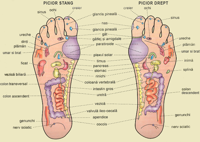 Obiectivul principal al reflexoterapiei este acela de a elimina toxinele si de a stimula functiile la nivelul intregului organism. Talpa piciorului este printre zonele unde se regasesc cele mai multe puncte reflexe. De fapt talpa piciorului este asemenea unei harti a intregului corp. Toate organele si zonele corpului au cate un punct reflex la nivelul talpii piciorului, incepand de la creier, continuand cu ochi, urechi, glanda tiroida, ficat, stomac, plamani, colon, ovare, rinichi, vezica urinara, pancreas si pana la duoden.